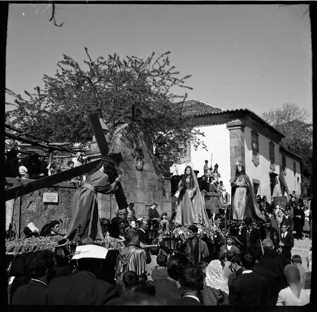 A primeira fotografia não pertence à procissão dos passos A imagem que se vê, é uma procissão festiva; a procissão dos passos não leva palio, no calvário quando Cristo é despregado e depositado no caixão então sim, entra em acção o palio preto... As lanternas das procissões festivas são diferentes das lanternas da semana santa Padre Branco enverga uma casula de festa, a personagem que segue atrás deve ser o padre Tomaz Nos anos sessenta do passado século as irmandades da misericórdia, do Santíssimo, da Ordem Terceira... participavam em todas as procissões A foto mostra os senhores; António "insonso" levando a cruz franciscana, ladeado pelo senhor Zé "companhia! o outro membro da irmandade parece ser o senhor Joaquim da Cruz! Os irmãos do Santíssimo levavam as lanternas e uma cruz processional. Mestre Joaquim dos Santos, dirige a banda; José Roque compenetrado, toca o seu bombardino. J.M.S
